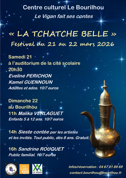 Samedi 21 mars à l'Auditorium de la cité scolaire à 20h30 : deux conteurs Eveline PERICHON et Kamel GUENNOUN (Ados et Adultes). Dimanche 22 mars à 11h au Le Bourilhou : les conteuses Malika VERLAGUET (enfants) et 16h : Sandrine ROUQUET (Public Familial)