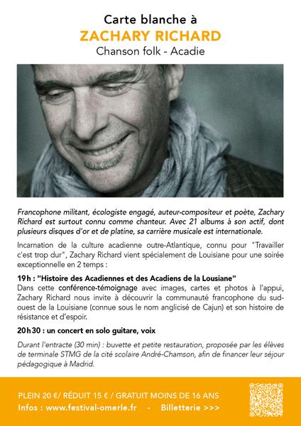 Incarnation de la culture acadienne,il viendra témoigner de notre histoire commune. Soirée rencontre en 2 temps : 1h de conférence témoignage et 1h de concert en solo guitare voix