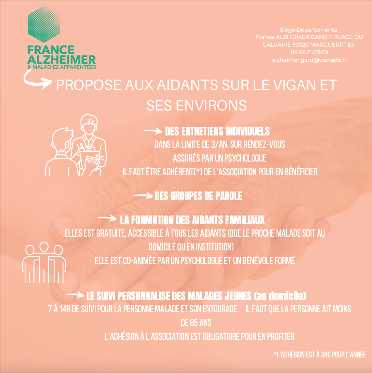 France Alzheimer du Gard propose aux aidants sur le Vigan et ses environs :