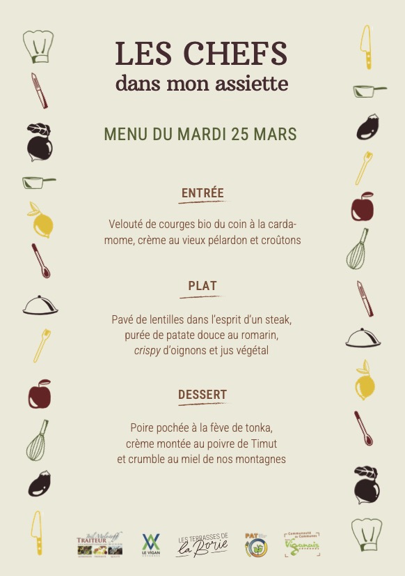 Accueil » Deux beaux projets pour la cantine ! » Menu – Chef dans mon assiette – Pays-viganais – 25 mars 2025