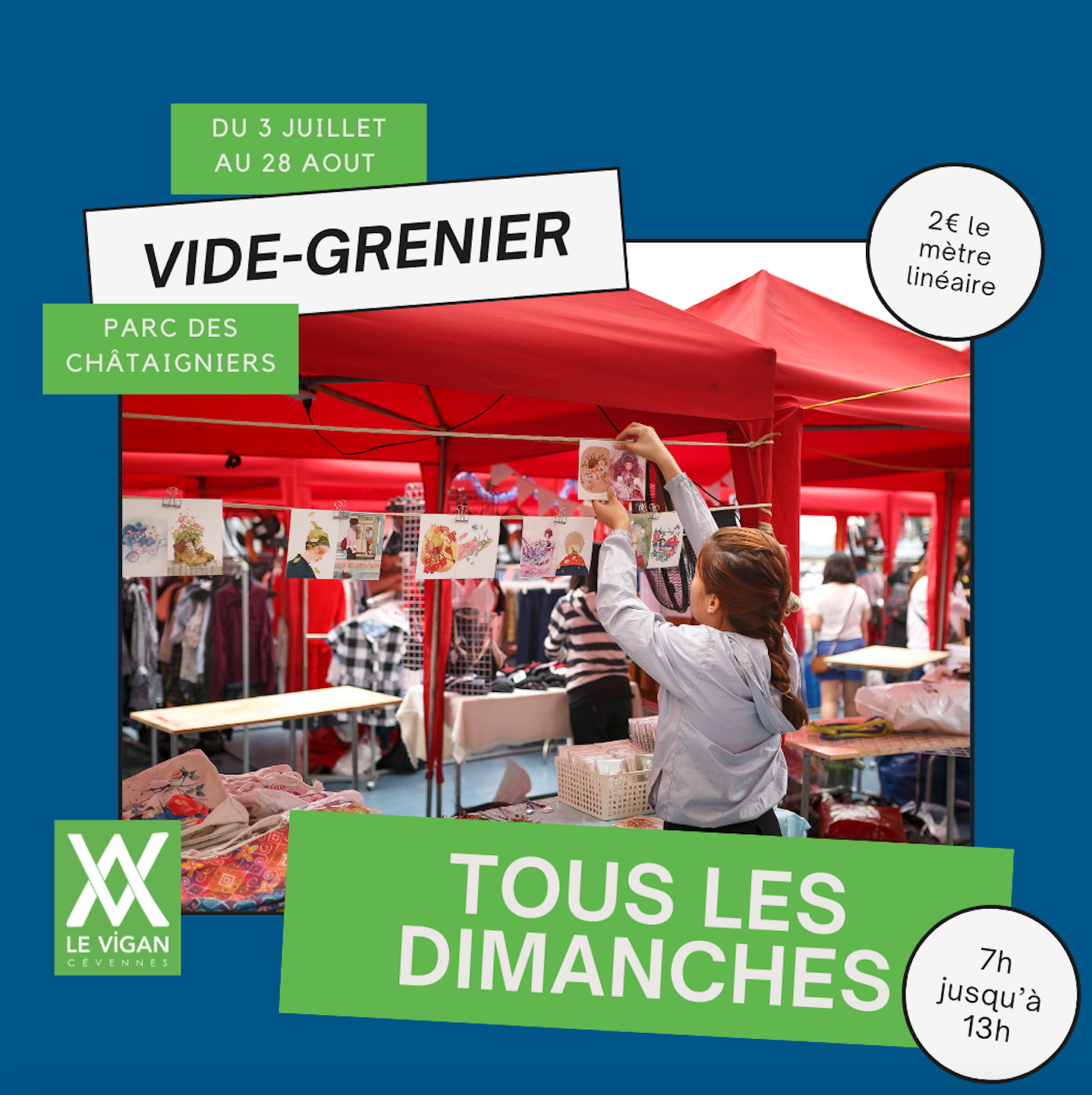 vide-grenier tous les dimanches Pensez à réserver votre emplacement auprès de la mairie du Vigan : 04 67 81 66 00 / service.accueil@levigan.fr Installation à partir de 7h